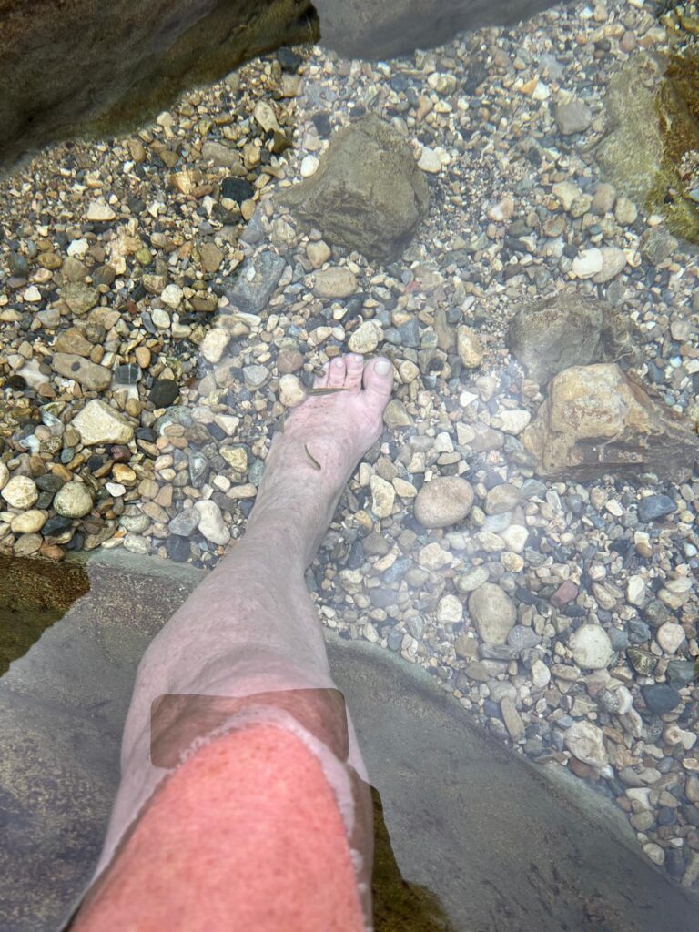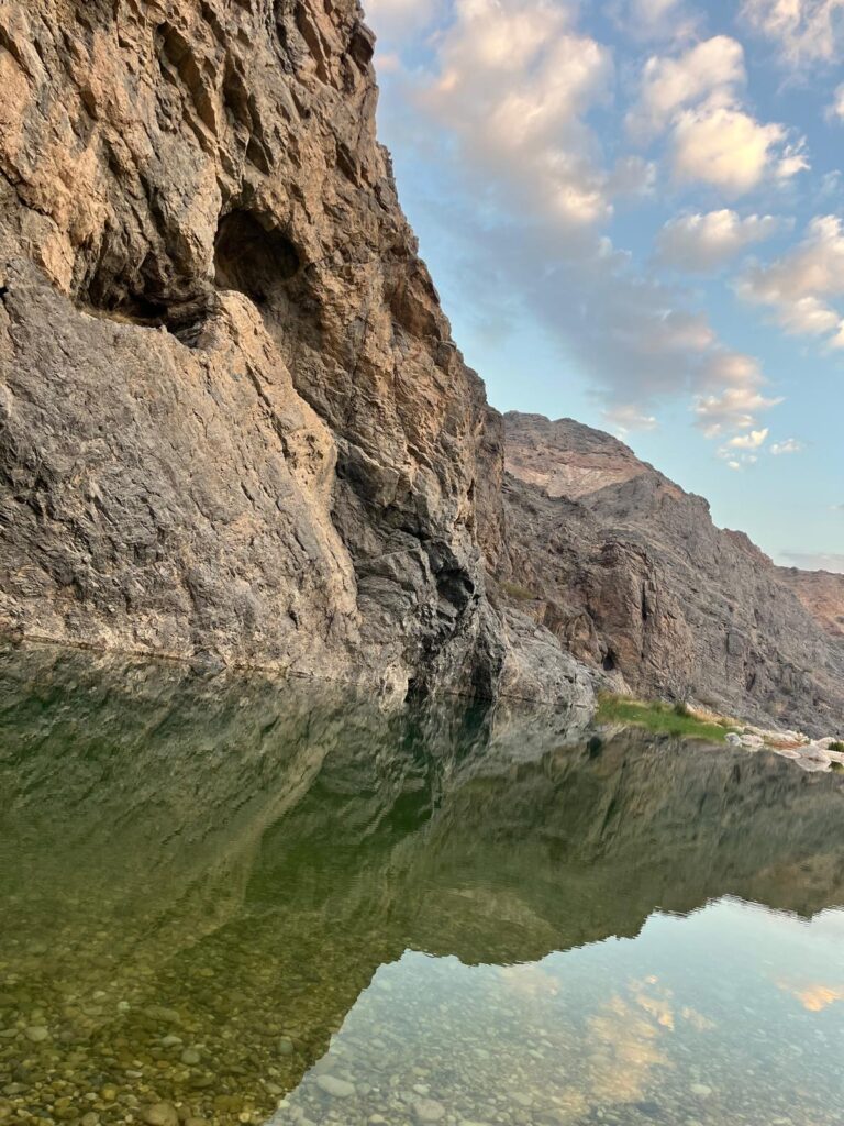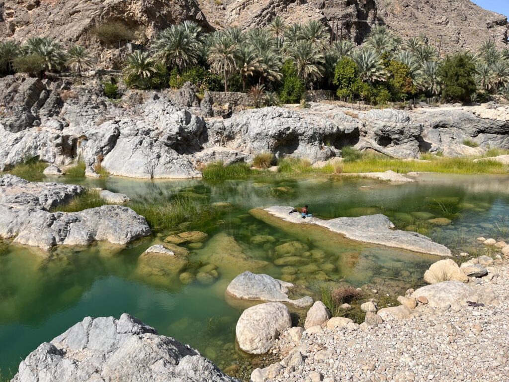 Da standen wir vor dem kleinen Resort umgeben von majestätischen Felsen und türkisfarbenen Wasser. Der Wadi lockte zum schwimmen und als ich meine Füße ins Wasser stellte knabberten unzählige kleine Fische an meinen Zehen.