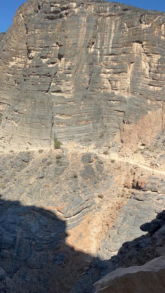 Morgens um 8 fuhren wir die abenteuerliche Passstraße zum Jebel Shams 3009 m hoch. Es ging richtig steil bergauf, so ähnlich wie früher der Quattro in der Werbung die Sprungschanze hoch fuhr. Steile Steigungen, enge Serpentinen, Staub und Geröll machten das ganze sehr rutschig. Einmal zu spät geschaltet und zu wenig Tempo, prompt drehten die Räder durch und es ging rückwärts und das schwere Auto rutschte langsam Richtung Abgrund. Joachim ließ den Wagen langsam zurück rollen bis die Reifen auf dem Schotter wieder Griff hatten. Jetzt erstmal beruhigen, durchatmen und ein neuer Anlauf mit mehr Schwung.